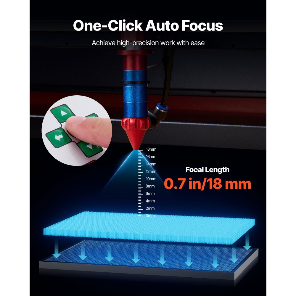 Enfoque automático preciso: La máquina de grabado láser de CO2 está equipada con un sistema de enfoque automático. El sistema controlado por motor ajusta automáticamente la altura del cabezal láser para adaptarla a su material. Solo hace falta introducir el grosor del material o utilizar el panel de control para obtener un enfoque preciso en todo momento