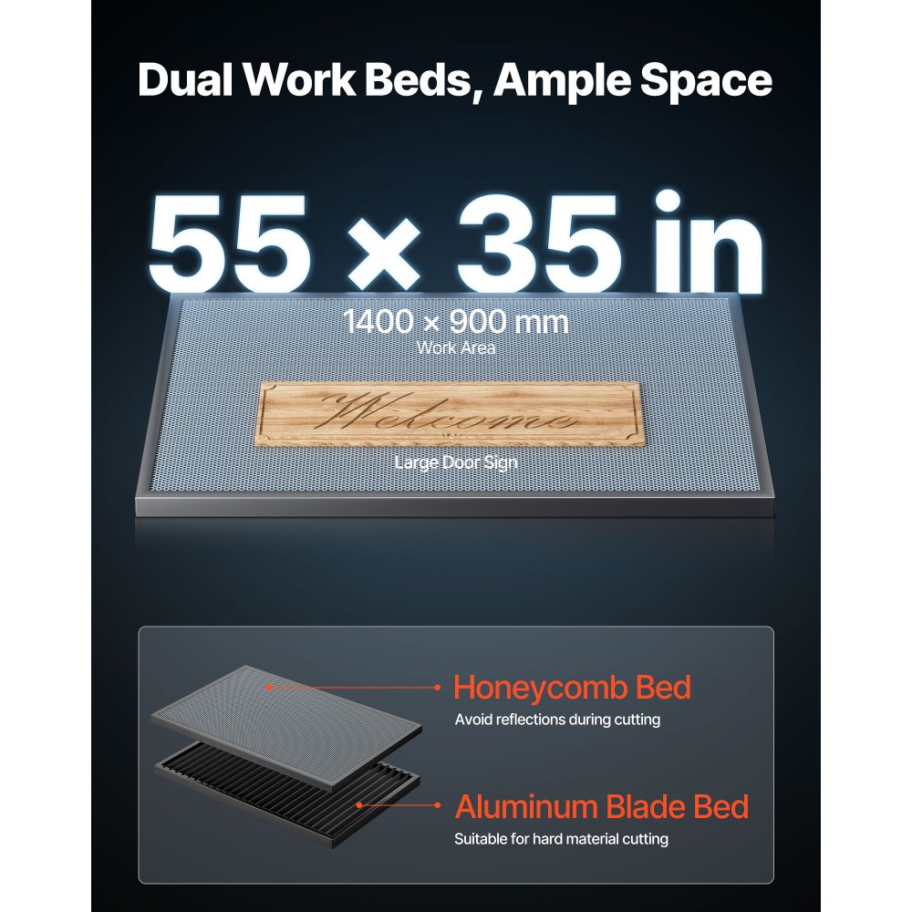 Dobles camas de trabajo espaciosas: El área de trabajo de 1400 x 900 mm tiene capacidad para letreros y paneles de muebles. El diseño de paso en 2 direcciones permite trabajar con materiales más largos y facilitar la alimentación manual. Esta cortadora y grabadora láser de CO2 dispone de una base de panal y otra de aluminio