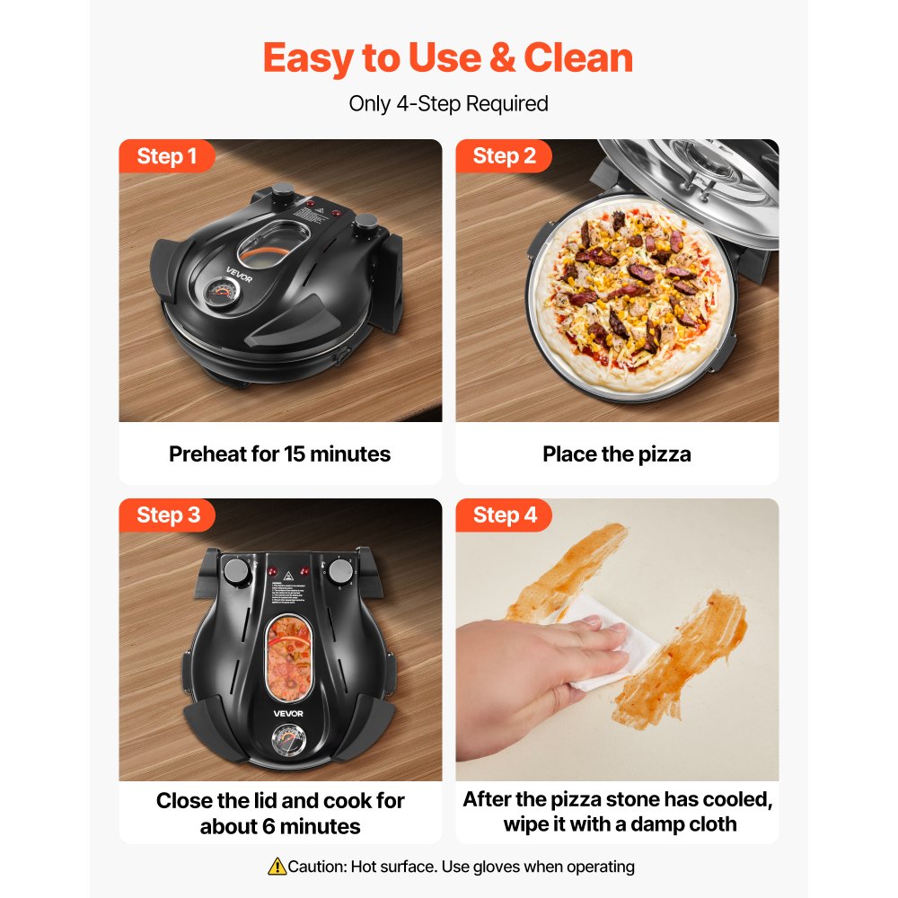 Horneado rápido a altas temperaturas: Este horno para pizza cuenta con 1200 W de potencia y dos tubos de calentamiento, uno superior y otro inferior. Alcanza una temperatura de 420 °C, lo que garantiza pizzas deliciosas y crujientes en 6 minutos sin encender el horno
