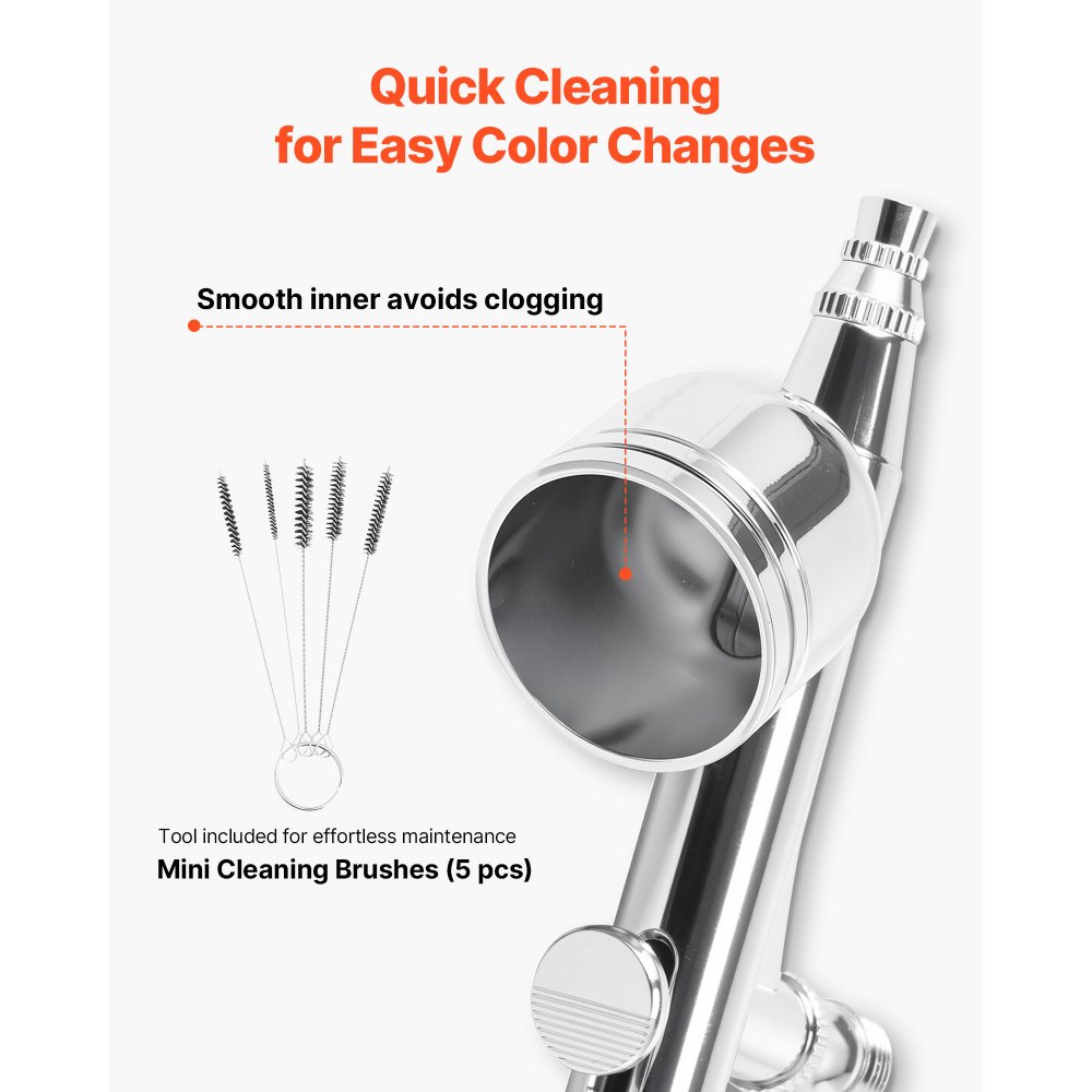 Limpieza sin esfuerzo y cambio de color rápido: Este kit de aerógrafo incluye un kit de limpieza completo y una cámara interior lisa para evitar obstrucciones. Cambia de color en segundos y mantén un rendimiento óptimo con el mínimo esfuerzo