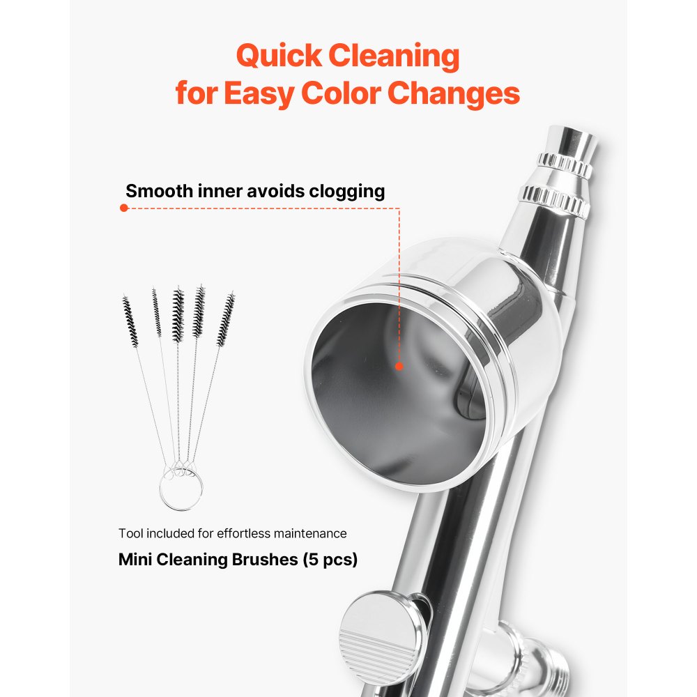 Limpieza sin esfuerzo y cambio de color rápido: Este kit de aerógrafo incluye un kit de limpieza completo y una cámara interior lisa para evitar obstrucciones. Cambia de color en segundos y mantén un rendimiento óptimo con el mínimo esfuerzo