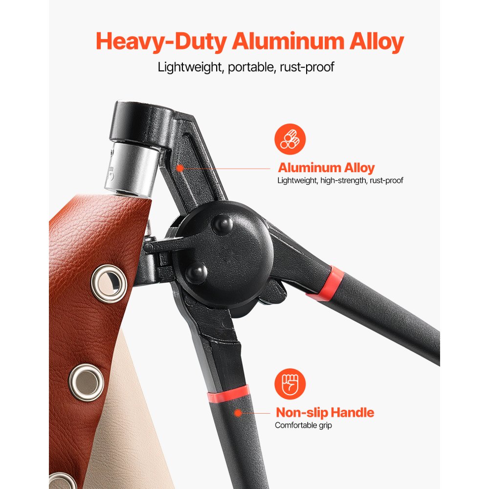 Cómodo y portátil: El kit de alicates para ojales está fabricado principalmente con una aleación de aluminio ligera pero duradera para minimizar la fatiga tanto en interiores como en exteriores. El mango antideslizante proporciona un agarre seguro, incluso en condiciones de humedad o de alta presión