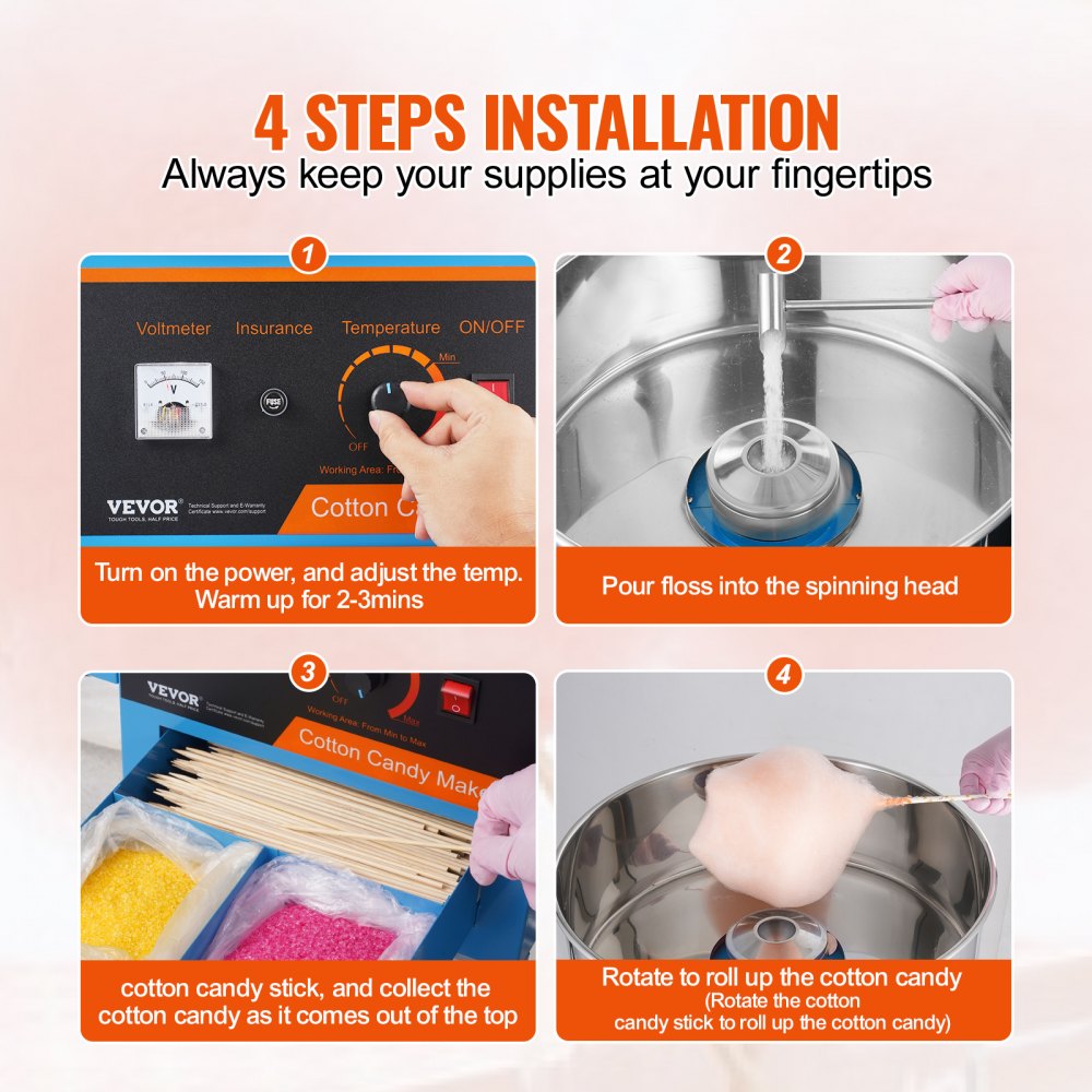 Control de temperatura: A diferencia de los modelos comunes, nuestra máquina eléctrica de algodón de azúcar tiene un voltímetro y un botón de control de temperatura. Al cambiar el voltaje, puede simplemente ajustar la temperatura de 244,9 °F/118,3 ℃ a 439,2 °F/226,2 ℃. Si quieres probar azúcares de diferentes sabores, definitivamente los necesitarás.