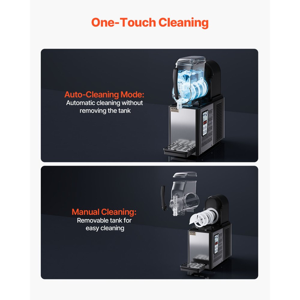 Duradera y fácil de limpiar: Fabricada con un cuerpo de acero inoxidable y un tanque de policarbonato apto para uso alimentario, esta máquina para granizados está diseñada para durar y es fácil de limpiar. El tanque cuenta con un botón de limpieza automática y los componentes modulares se pueden desmontar fácilmente sin herramientas para facilitar el mantenimiento y la limpieza.