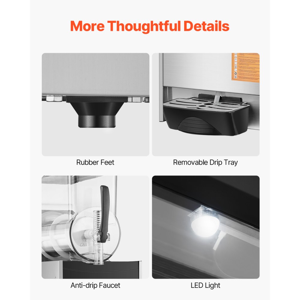 Tanque único de 12 L: Con un tanque con capacidad de 12 L, esta máquina para hacer granizados puede preparar aproximadamente 48 tazas de bebidas granizadas por tanda. Requiere una recarga menos frecuente, lo que la hace perfecta para uso comercial con mucho tráfico. El tanque transparente muestra de forma hermosa las bebidas coloridas, lo que la convierte en una excelente opción para heladerías, hamburgueserías, cafeterías, bares y otros entornos comerciales.