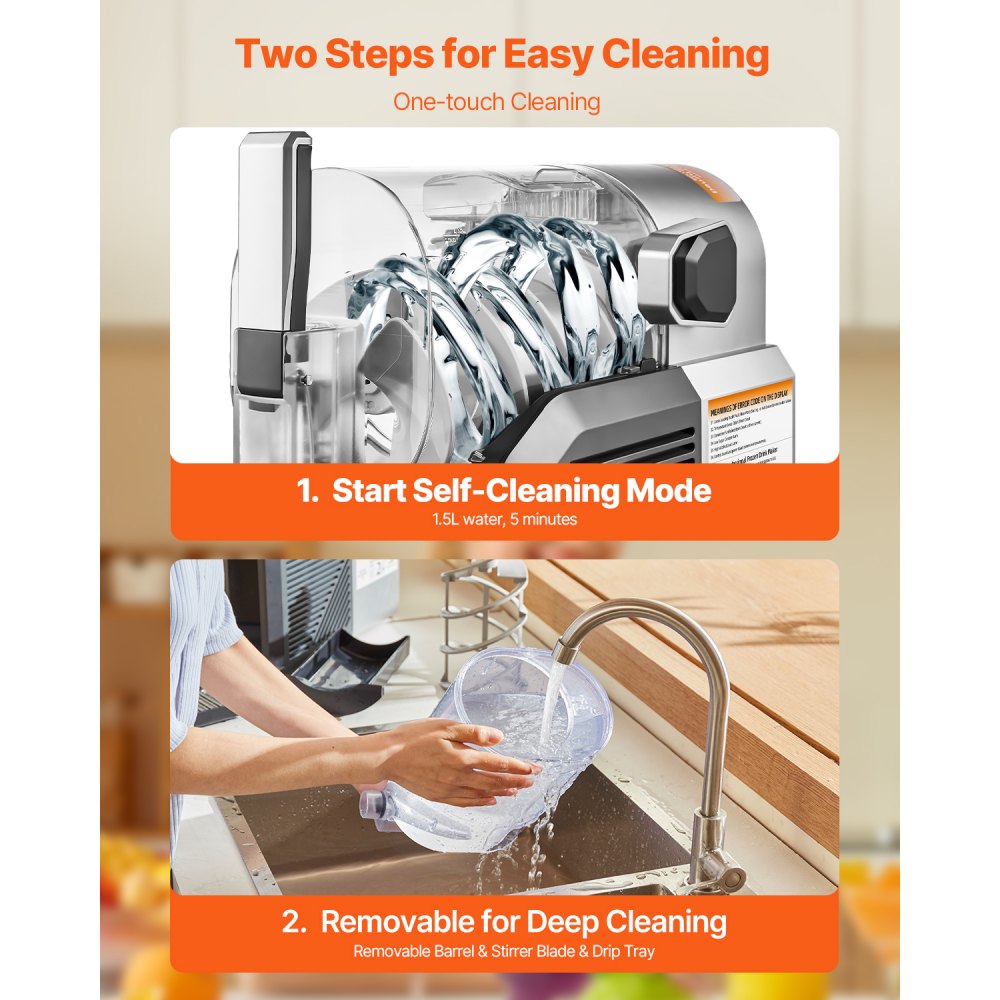 Fácil de limpiar: Esta máquina de bebidas heladas cuenta con un modo de autolimpieza para facilitar su mantenimiento. Para una limpieza profunda, simplemente desbloquee la manija trasera, retire el barril y las piezas, y luego enjuáguelas con agua o colóquelas en el lavavajillas. Además, cuenta con una bandeja de goteo extraíble en la parte inferior para mayor comodidad de limpieza