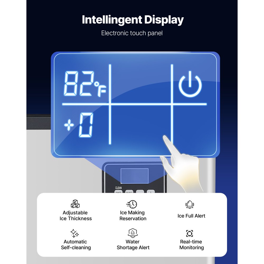 Panel de control inteligente: La máquina de hielo cuenta con una pantalla táctil electrónica que permite ajustar el grosor del hielo ajustando el tiempo de producción. Puede iniciar la autolimpieza con un solo clic y supervisar el estado de la producción en todo momento