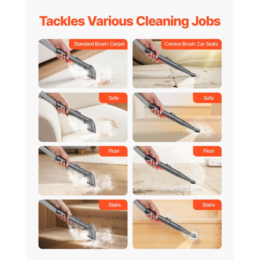Limpieza eficiente: Nuestra máquina limpiadora de alfombras cuenta con un cable de alimentación de 16,4 pies y una manguera flexible de 5,41 pies para una cobertura completa de la habitación, lo que elimina la necesidad de reposicionar y buscar enchufes; incluye cepillo para alfombras (combinación de cepillo y succión para manchas de café/mermelada) y herramienta para grietas (para huecos de muebles) para una limpieza completa del hogar