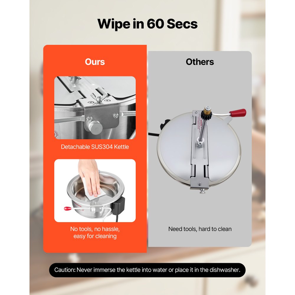 Fácil de usar y limpiar: Dos fantásticos interruptores controlan toda la unidad: luz y calentador, calentador y agitador. Además, las tuercas de mariposa del recipiente permiten retirar fácilmente la tapa de la máquina de palomitas y limpiar a fondo el interior