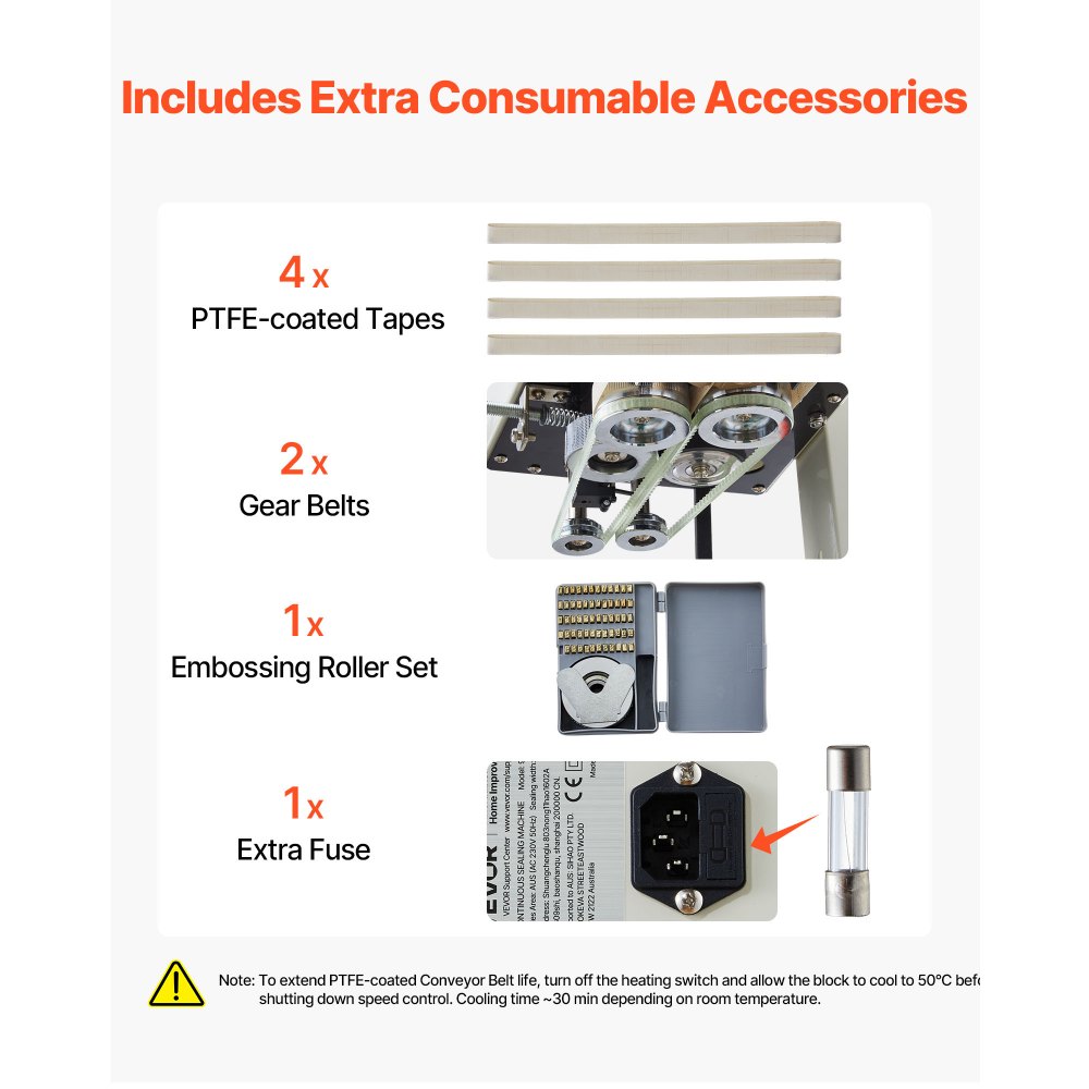 Accesorios completos: La máquina de sellado térmico incluye una correa dentada, una cinta transportadora recubierta de PTFE, un fusible y un juego de ruedas de estampado. Estos accesorios reducen el tiempo de inactividad, facilitan el uso a largo plazo y ayudan a mantener la línea de producción funcionando sin problemas