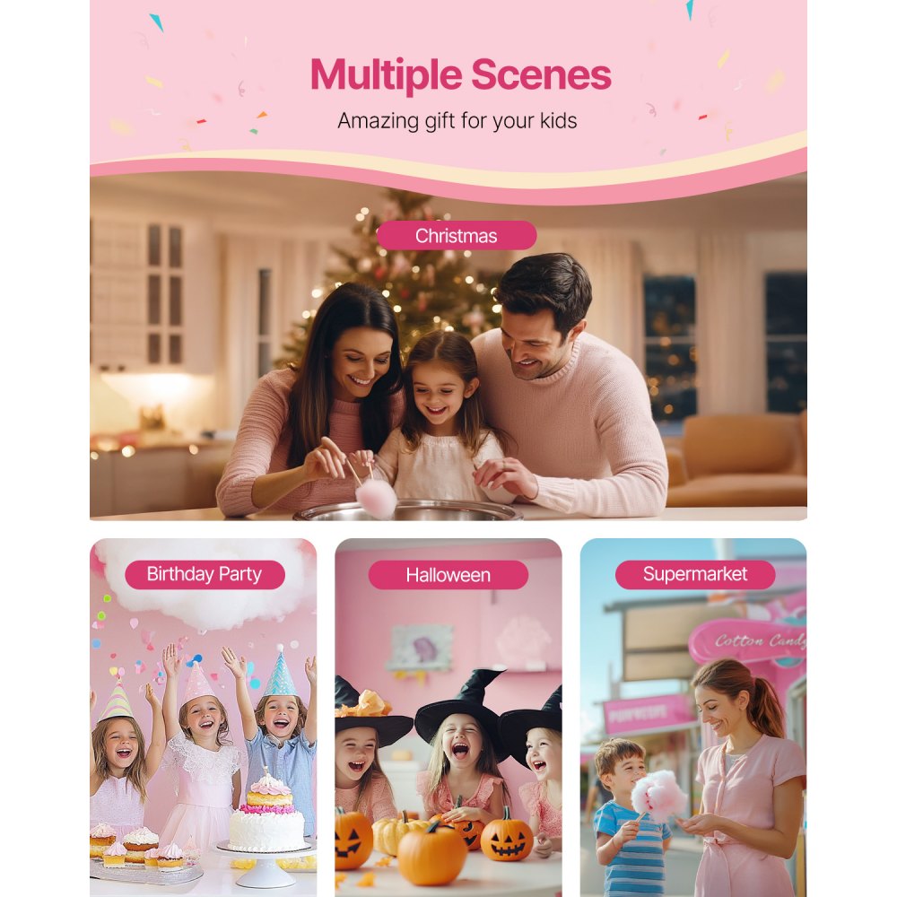 Trabaja con cualquier dulce que te guste: Esta máquina para hacer algodón de azúcar te permite usar azúcar de hilo dental, azúcar de leche, cubos de fruta o cualquiera de tus caramelos duros favoritos para preparar deliciosos algodones de azúcar. Con su tamaño compacto, es ideal para usar en la encimera y es perfecta para carnavales, festivales, fiestas de cumpleaños y eventos deportivos