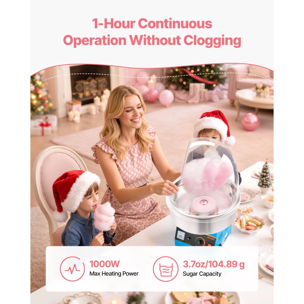Mayor potencia: Experimente un rendimiento excepcional con nuestra máquina de algodón de azúcar para niños, con 1000 W de capacidad de calentamiento y un azucarero de 104,89 g. Funciona a una velocidad de hasta 3500 RPM durante una hora de centrifugado continuo, ideal para caramelos de cristal, duros o de leche (gel no incluido)