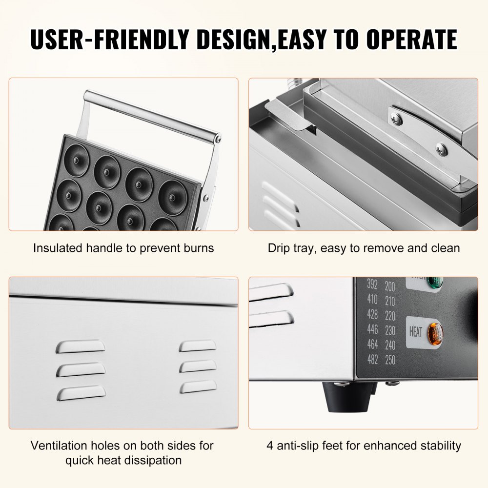 Diseño centrado en el usuario: Nuestra máquina comercial de donuts para gofres incluye un mango de acero inoxidable resistente al calor para evitar quemaduras. Una bandeja de goteo que es fácil de desmontar para su limpieza. Ventilaciones laterales para un enfriamiento más rápido, lo que garantiza que la máquina funcione de manera eficiente. Pies antideslizantes para mayor estabilidad y facilidad de uso de la máquina para hacer donuts.