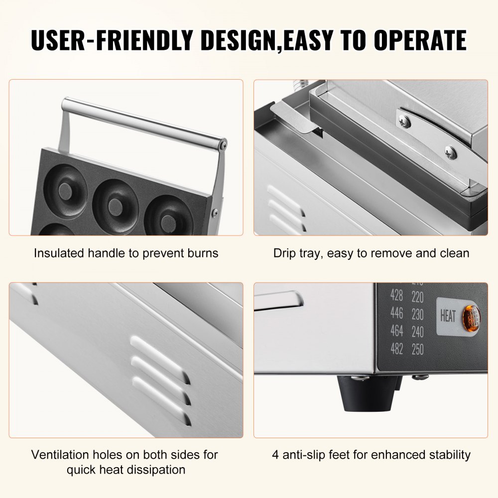 Diseño centrado en el usuario: nuestra máquina comercial de donuts para gofres incluye un mango de acero inoxidable resistente al calor para evitar quemaduras. Una bandeja de goteo que es fácil de desmontar para su limpieza. Ventilaciones laterales para un enfriamiento más rápido, lo que garantiza que la máquina funcione de manera eficiente. Pies antideslizantes para mayor estabilidad y facilidad de uso de la máquina para hacer donuts.