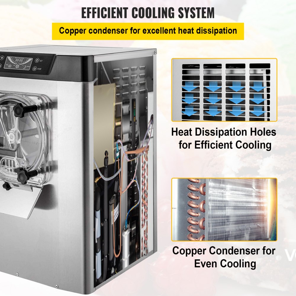 Rápida Disipación del Calor: Adopta un sistema de refrigeración de alta eficiencia, el condensador de tubo de cobre incorporado mejora la refrigeración uniforme y la disipación del calor. Y el lado de la máquina de helados duros tiene un diseño de ventilación, que mejora la eficiencia de la conversión de frío y calor y asegura una buena disipación de calor. Proporciona una máquina para un uso prolongado
