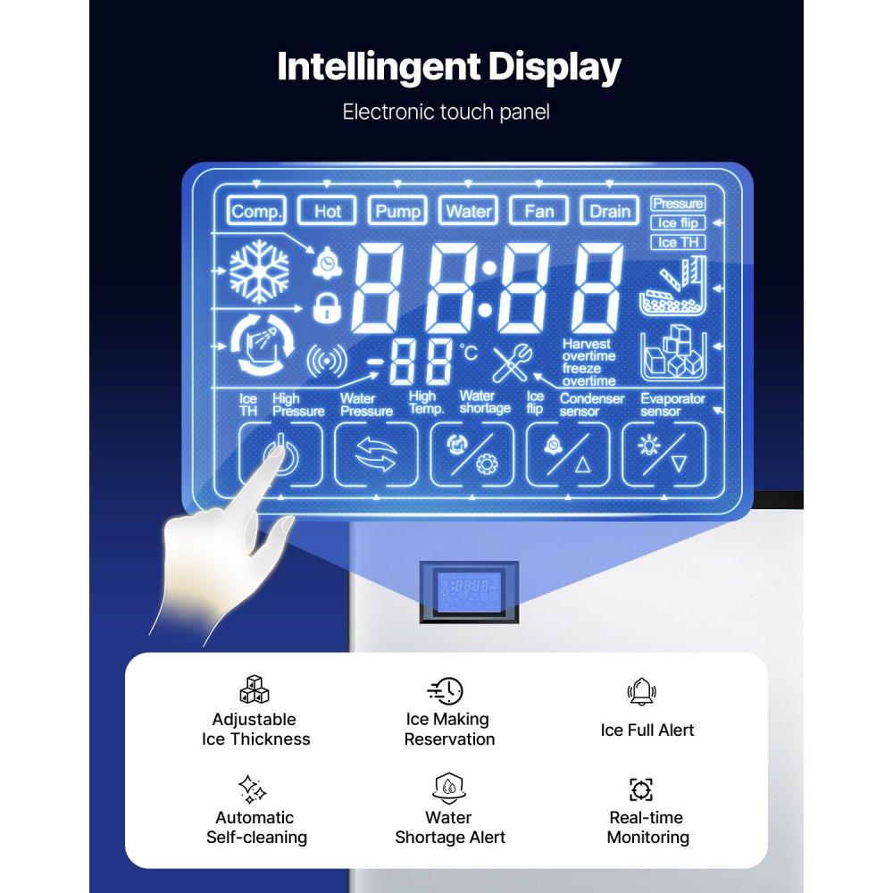 Panel de control inteligente: La pantalla táctil electrónica le permite ajustar el grosor del hielo aumentando o acortando el tiempo de fabricación. La función de limpieza automática con un solo botón hace que la máquina sea más cómoda. Las luces indicadoras del panel le permiten controlar el estado de la máquina de hielo en tiempo real