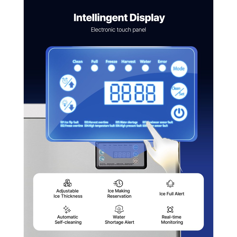 Panel de control inteligente: La máquina de hielo cuenta con una pantalla táctil electrónica que permite ajustar el grosor del hielo ajustando el tiempo de producción. Puede iniciar la autolimpieza con un solo clic y supervisar el estado de la producción en todo momento
