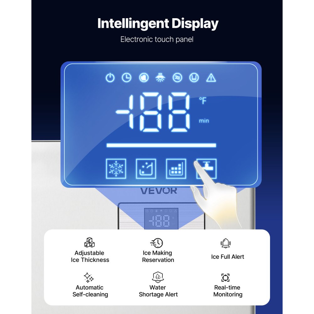 Panel de control inteligente: La máquina de hielo cuenta con una pantalla táctil electrónica que permite ajustar el grosor del hielo ajustando el tiempo de producción. Puede iniciar la autolimpieza con un solo clic y supervisar el estado de la producción en todo momento