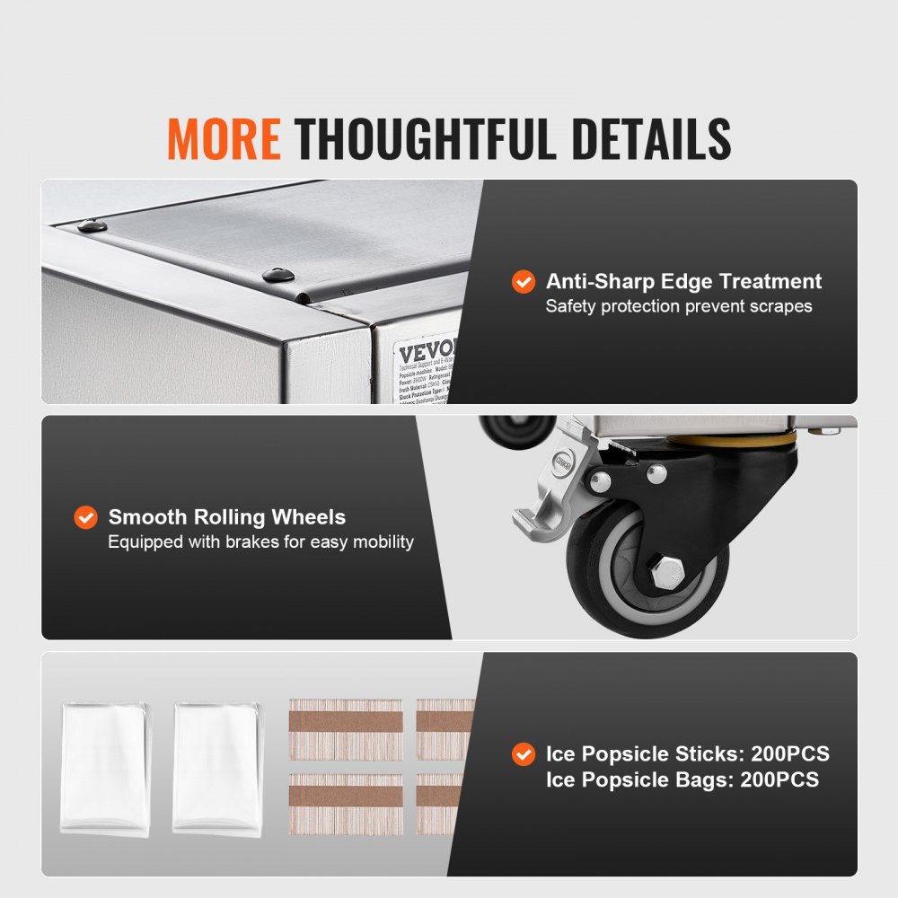 Construcción duradera: fabricada con acero inoxidable SUS304 apto para uso alimentario para la encimera, la cubeta de hielo y el molde, y acero inoxidable SUS201 para la carcasa, nuestra máquina para hacer paletas heladas con un solo molde es resistente a la corrosión, fácil de limpiar y presenta bordes redondeados para mayor seguridad y comodidad.