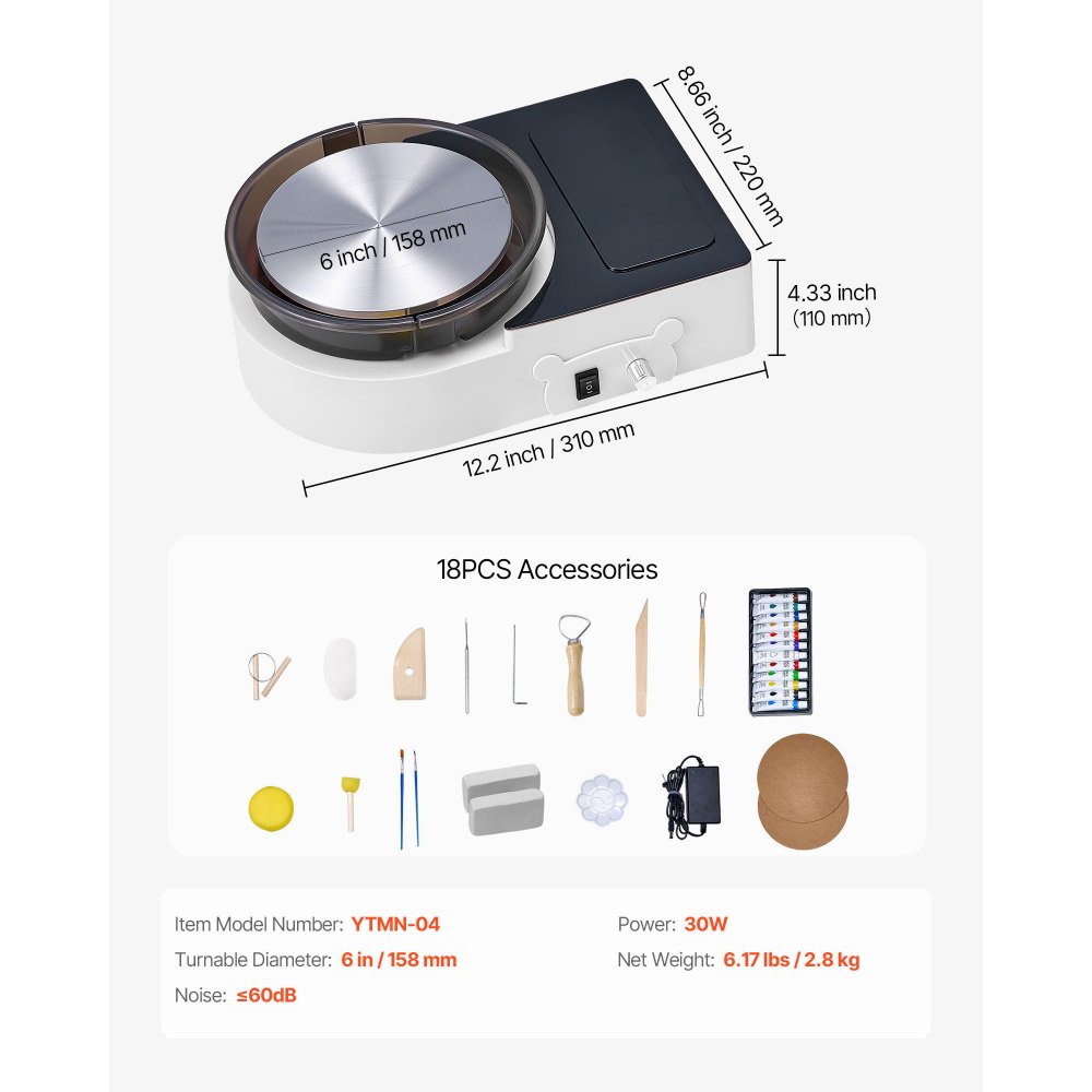 Mini torno de alfarería: Este mini torno de alfarería para niños y adultos cuenta con un potente motor de 30 W y un plato giratorio de aleación de aluminio de 15 cm. Resistente y estable, es ideal para que niños de diferentes edades exploren su creatividad cerámica