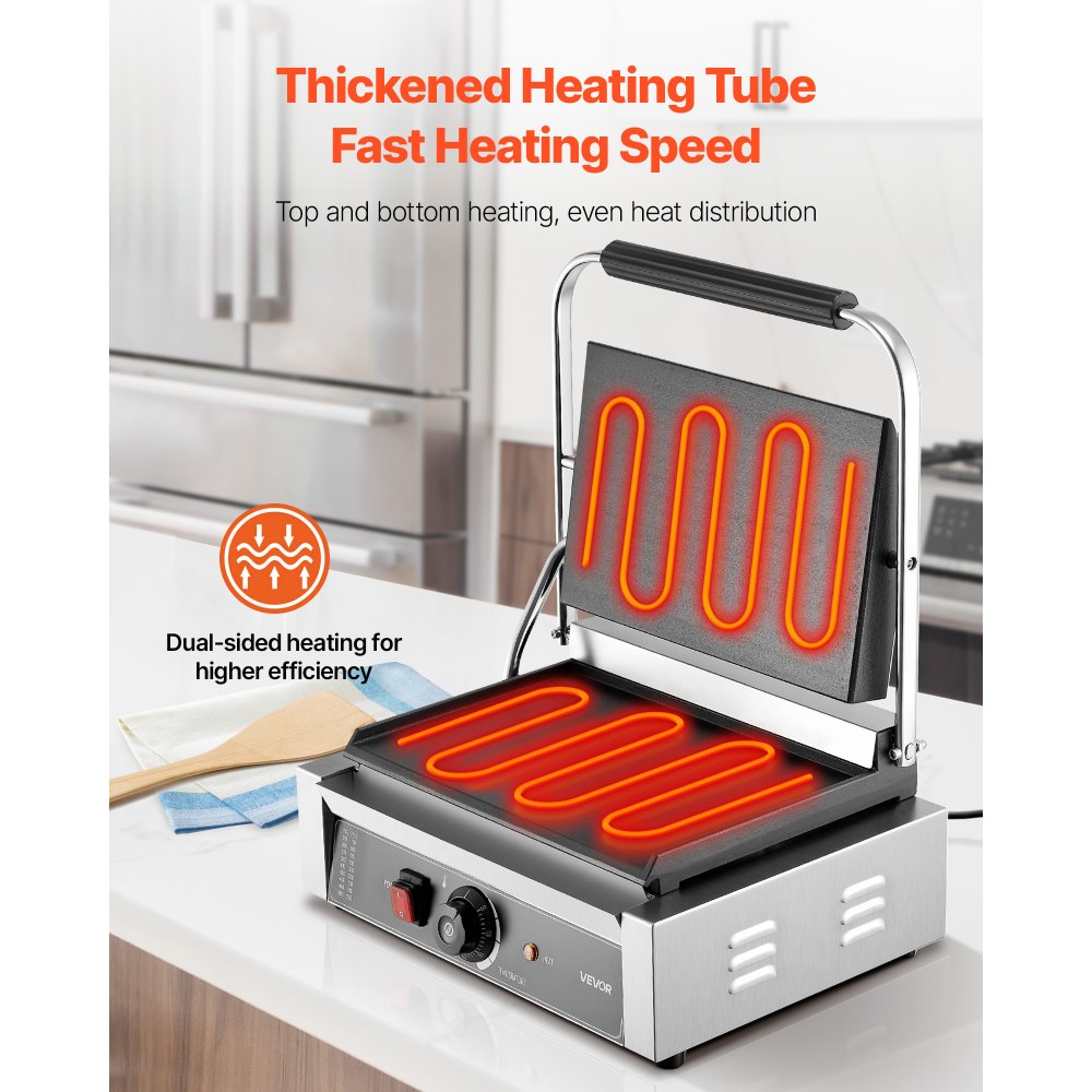 Robusta y duradera: Esta parrilla de contacto comercial cuenta con un exterior de acero inoxidable y una placa reforzada con revestimiento de esmalte. El mango extensible de ABS previene quemaduras y las patas antideslizantes ofrecen mayor seguridad