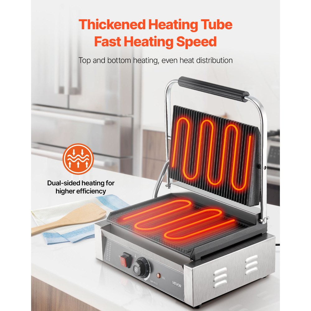 Parrilla de Prensa para Panini Placa Esmaltada de 34 x 23 cm Prensa Eléctrica para Sándwiches de Acero Inoxidable con Asa Control de Temperatura con Ranuras Completas para Filetes, Tocino - Tecnología