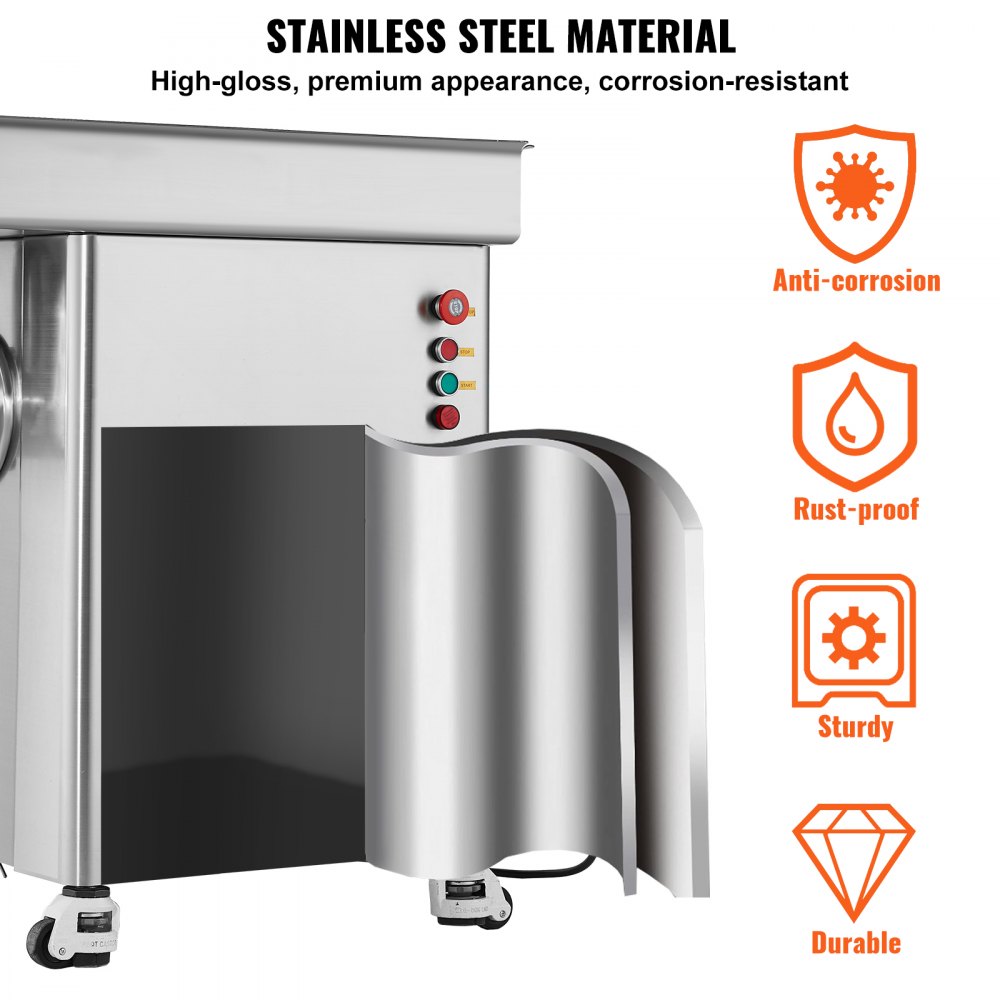 Construcción robusta: Toda la máquina está hecha de acero inoxidable, con cuchillas afiladas SUS420 que son duraderas y capaces de moler cartílago de pollo, carne congelada y más