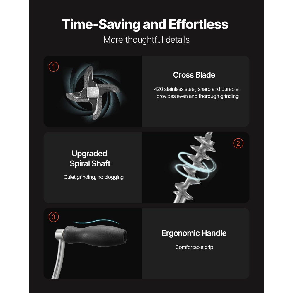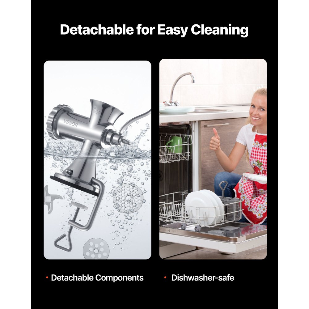 Una picadora de carne, usos infinitos: La picadora de carne manual multifuncional VEVOR permite moler fácilmente verduras y carne para hacer albóndigas, galletas, salchichas y más. También viene con placas de corte de 5 mm y 8 mm, 1 cuchilla transversal de corte, 1 tubo para salchichas de acero inoxidable, 1 accesorio para galletas, 1 cabezal para moler y varilla empujadora de carne, que satisfacen las diversas necesidades de diferentes creaciones culinarias.