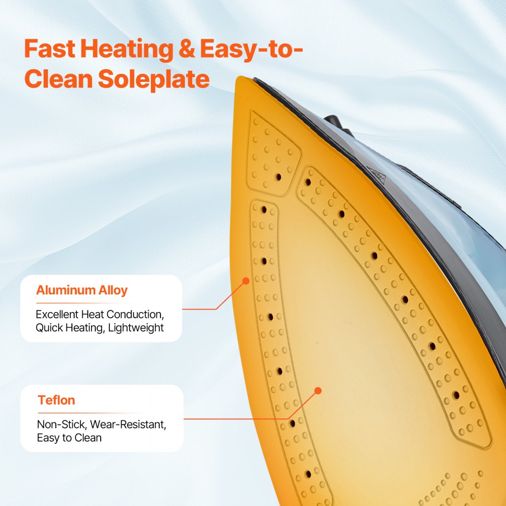 Suela duradera: El material de aleación de aluminio proporciona una excelente durabilidad y una conducción eficiente del calor. La suela proporciona una superficie suave y antiadherente que se desliza fácilmente sobre las telas, lo que facilita el planchado y garantiza una limpieza sencilla