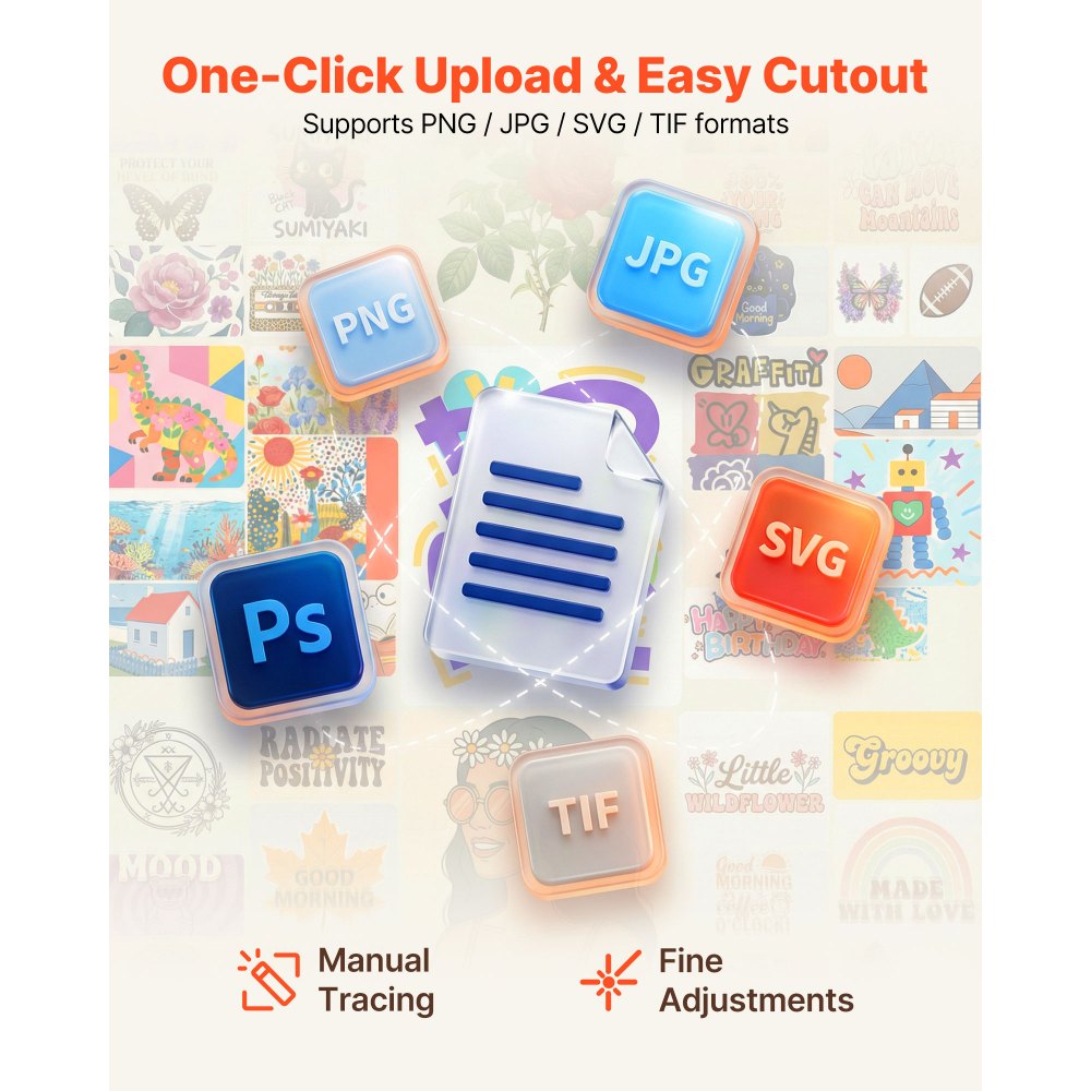 Maneja diseños detallados con facilidad: Este plotter de corte de vinilo admite los formatos de archivo PNG, JPG, SVG y TIF para facilitar la importación y exportación de imágenes. Desde líneas finas hasta patrones detallados, te ayuda a dar vida a sus diseños sin simplificar su trabajo artístico