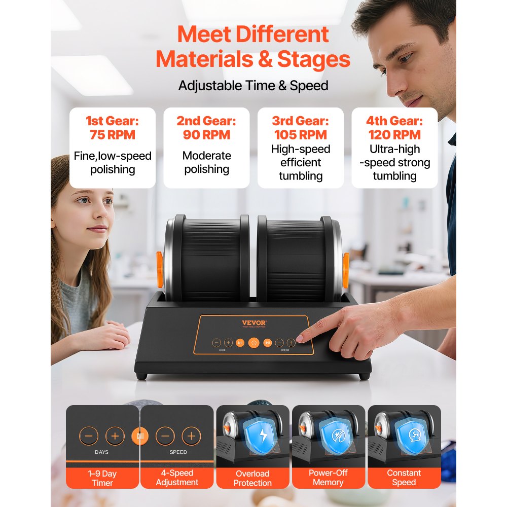 Ajuste flexible: Nuestra pulidora de piedra cuenta con un temporizador de 1 a 9 días y 4 velocidades, de 75 a 120 rpm, para satisfacer las necesidades de pulido de diferentes materiales y niveles. Con protección contra sobrecarga y memoria de apagado, reanuda automáticamente el ciclo restante tras un corte de energía. El diseño de velocidad constante garantiza resultados más suaves y consistentes