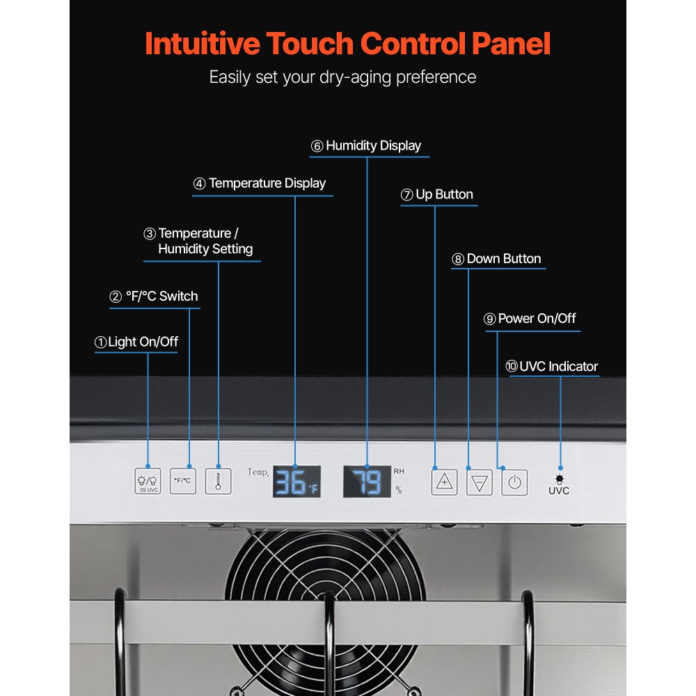 Control preciso de temperatura y humedad: El refrigerador para maduración en seco ofrece un amplio rango de ajuste de temperatura de 1 °C a 25 °C y una humedad del 60 % al 85 %. Personalice fácilmente el ambiente para carne de res, cerdo, cordero, queso y más con el panel de control digital