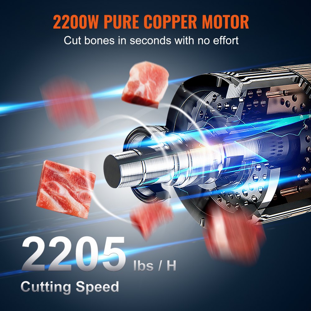 Estable y eficiente: El motor de cobre puro de 2200 W proporciona una potencia impresionante y la hoja de sierra afilada de acero inoxidable, junto con los engranajes de precisión, garantiza una eficiencia de corte de hasta 1000 kg/h. Nuestra cortadora de huesos eléctrica corta suavemente sin atascarse, lo que le permite cortar fácilmente varios huesos duros y carne congelada con un suave empujón.