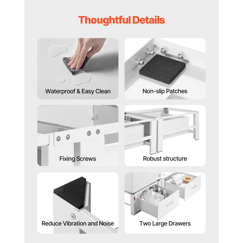 Estabilidad antivibración profesional: Con una altura de elevación, este pedestal para lavadora ayuda a reducir la inclinación y la tensión en las rodillas. Las almohadillas amortiguadoras reducen significativamente la vibración y el ruido, manteniéndose estable incluso durante ciclos de centrifugado a alta velocidad