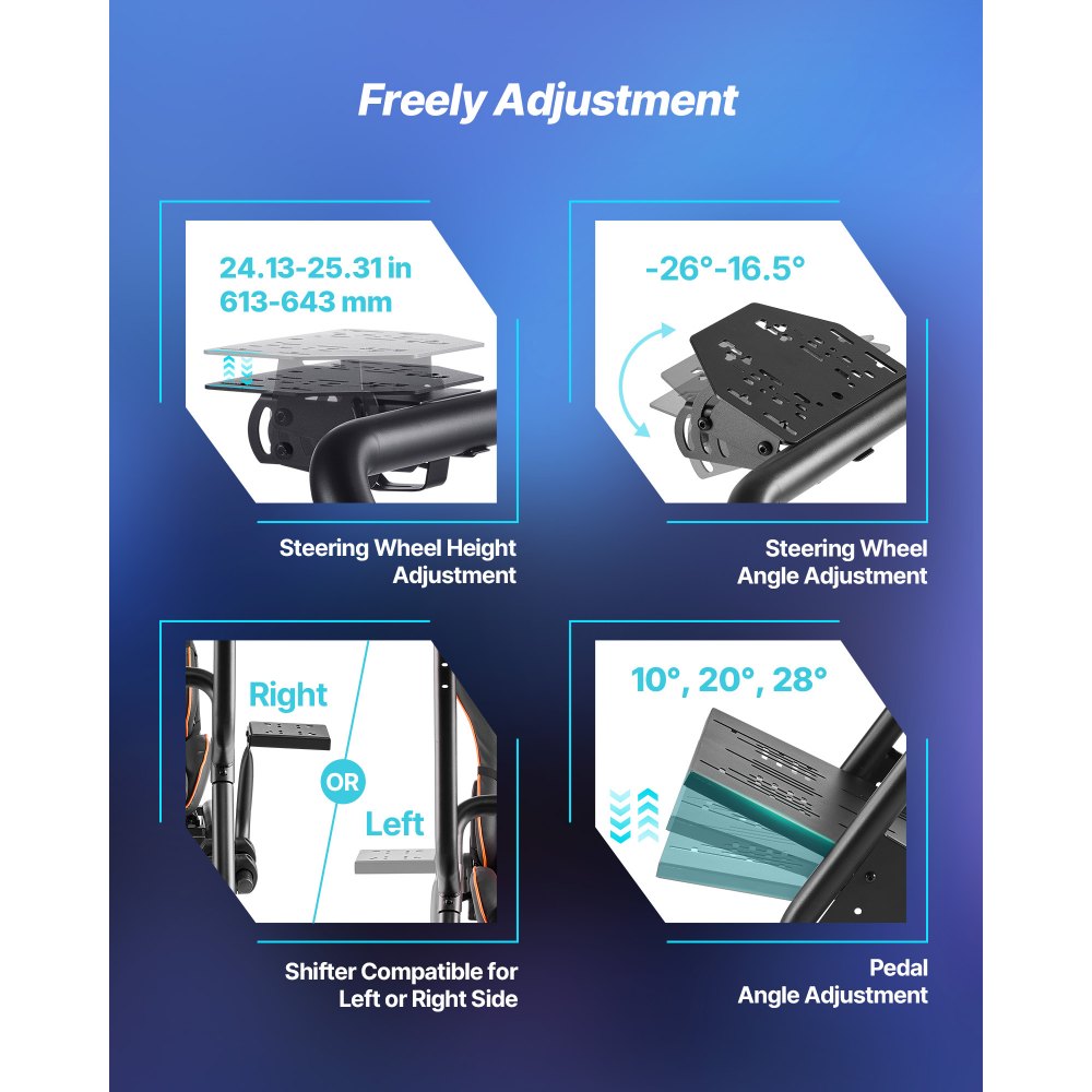 Totalmente ajustable: La altura y el ángulo del volante son ajustables, los pedales ofrecen 3 posiciones de ángulo y la palanca de cambios se puede girar a la izquierda o a la derecha. Este soporte de simulación de carreras te permite disfrutar de una experiencia de conducción cómoda y realista en cualquier circuito o juego de carreras