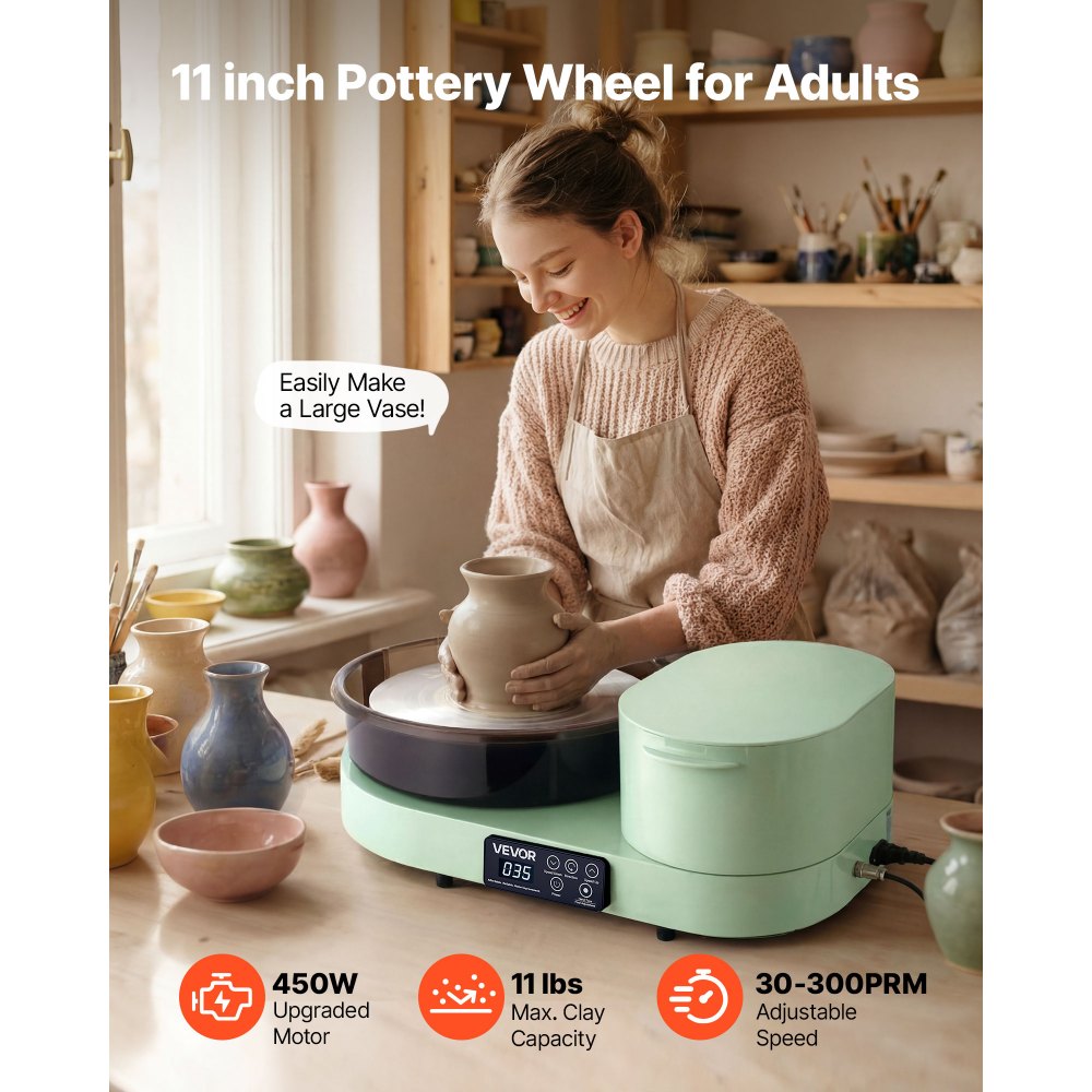 Torno de Alfarero, Placa de 28 cm, Rueda de Cerámica Eléctrica, Velocidad Ajustable de 30 a 300 RPM, Máquina de Modelado con Pedal Pantalla Almacenamiento, Metal, para Arcilla Bricolaje, Verde