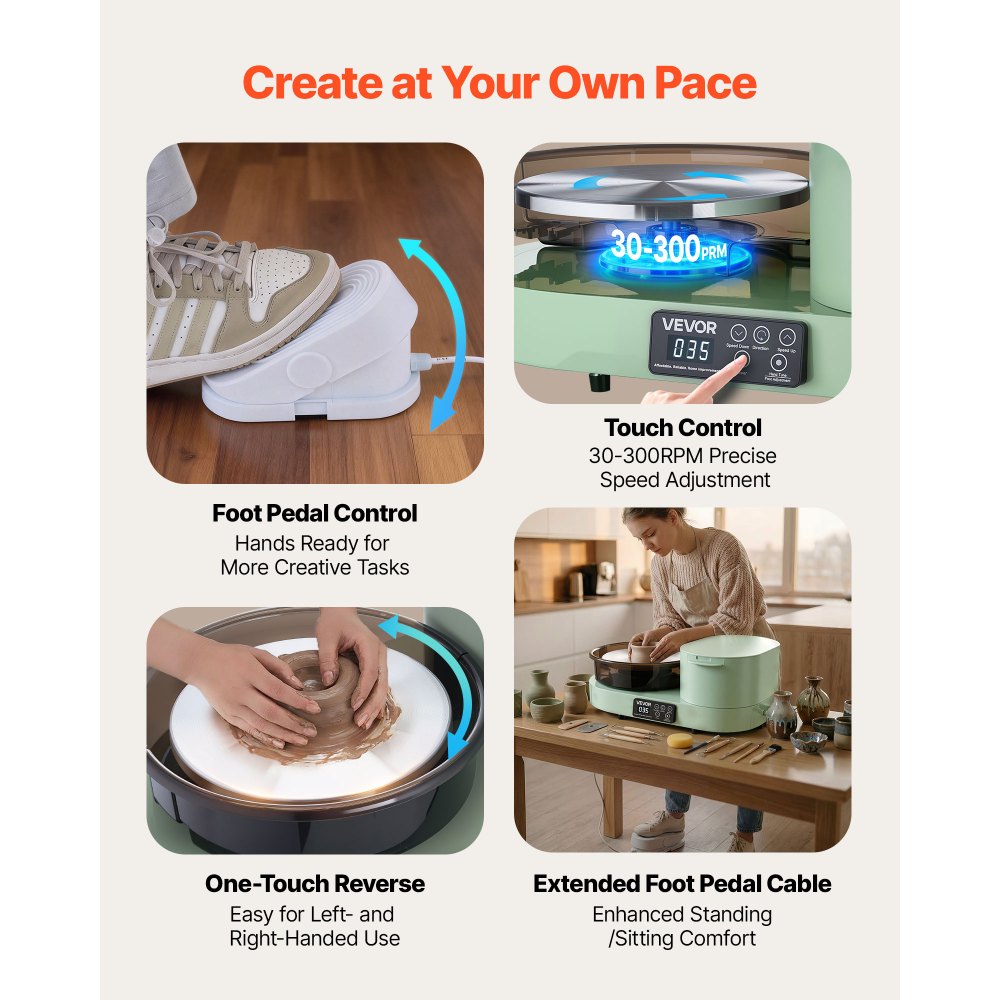 Torno de Alfarero, Placa de 28 cm, Rueda de Cerámica Eléctrica, Velocidad Ajustable de 30 a 300 RPM, Máquina de Modelado con Pedal Pantalla Almacenamiento, Metal, para Arcilla Bricolaje, Verde - Tecnología