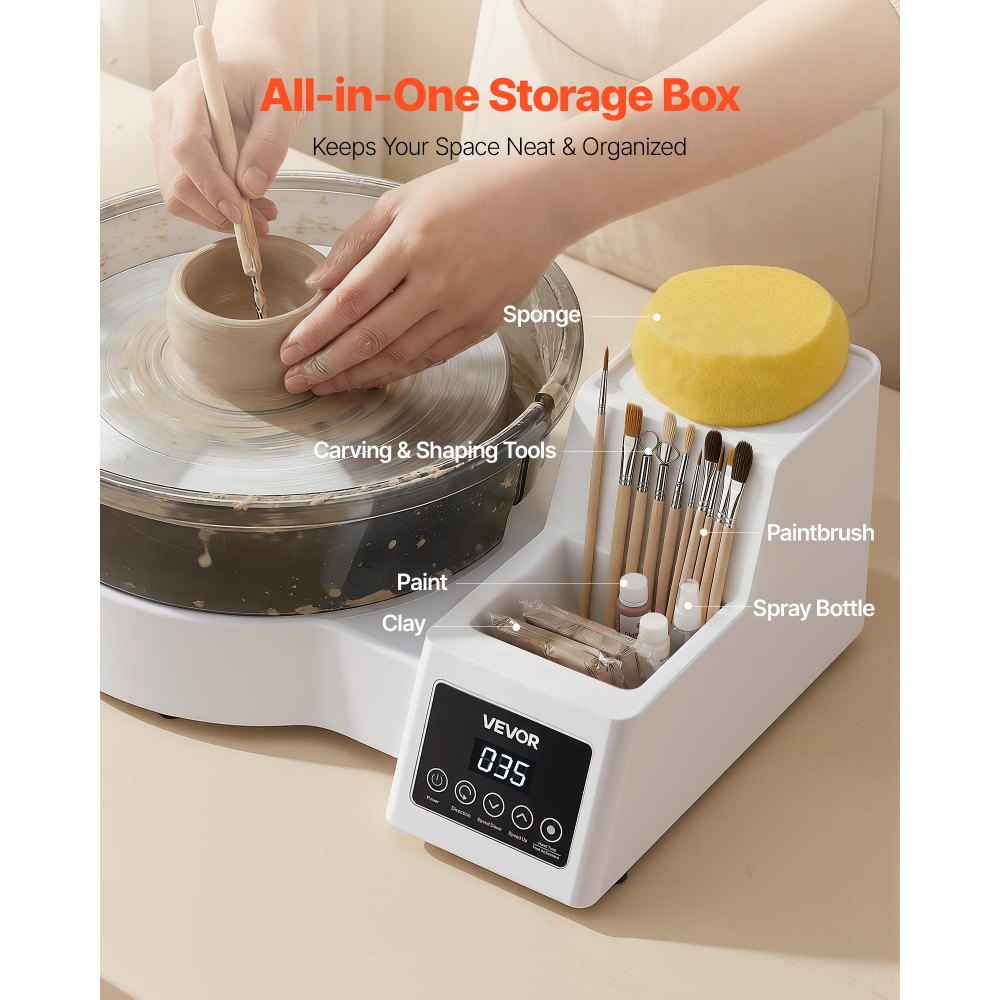 Almacenamiento de herramientas integrado: Nuestra rueda de cerámica eléctrica le permite concentrarse en su arte. La caja de almacenamiento de doble nivel mantiene las herramientas de corte, pinturas y los artículos esenciales a mano, reduciendo el desorden para un flujo de trabajo creativo e ininterrumpido