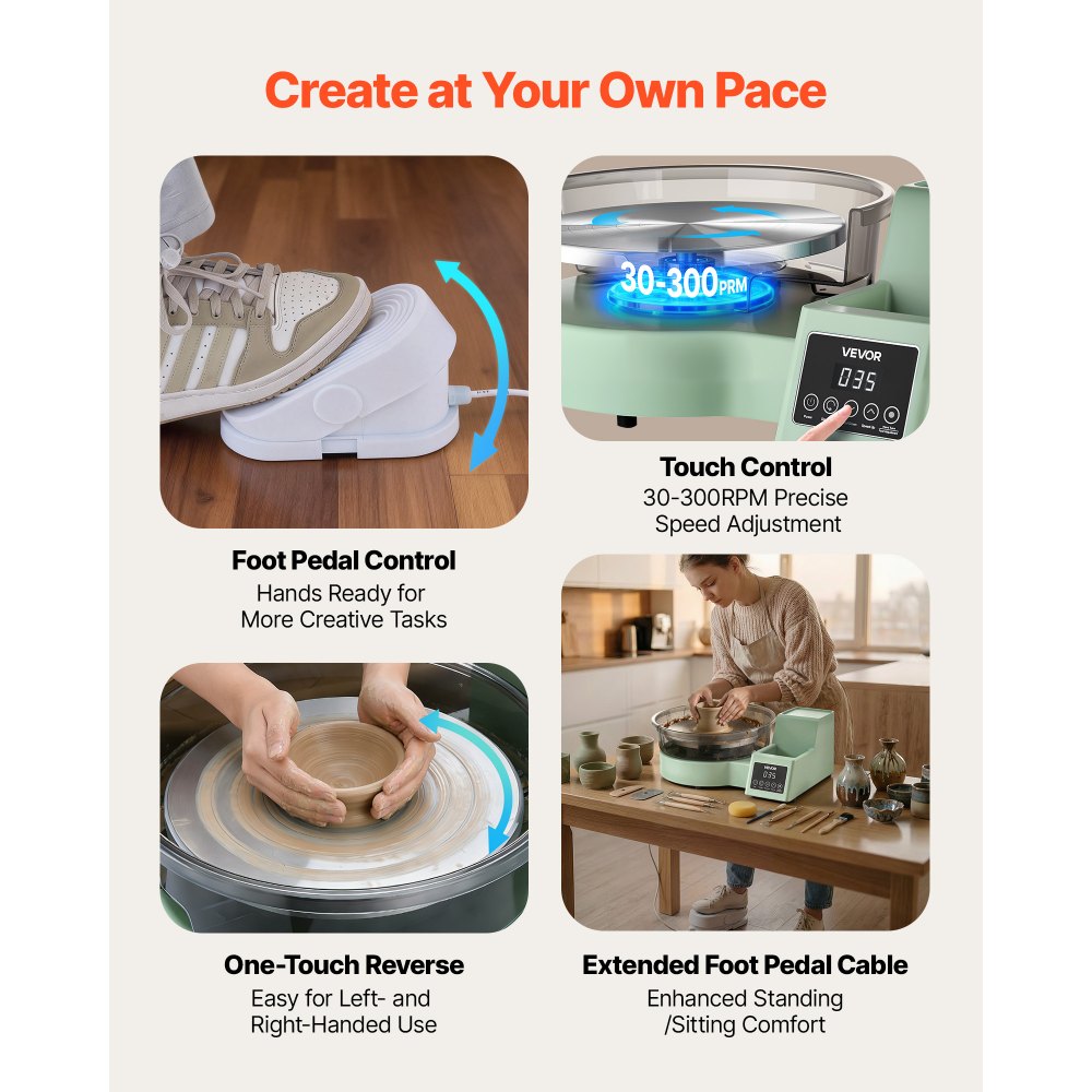 Torno de Alfarero, Placa de Aluminio 28 cm, Rueda de Cerámica Eléctrica, Velocidad Ajustable de 30 a 300 RPM, Herramienta de Arcilla con Pedal Pantalla Almacenamiento, para Bricolaje, Verde - Tecnología