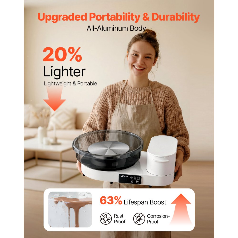 Torno de Alfarero, Placas de 36 y 28 cm, Rueda de Cerámica Eléctrica, Velocidad de 30 a 300 RPM, Máquina de Alfarería con Pedal Pantalla Almacenamiento, Aluminio, para Bricolaje Arcilla, Blanco