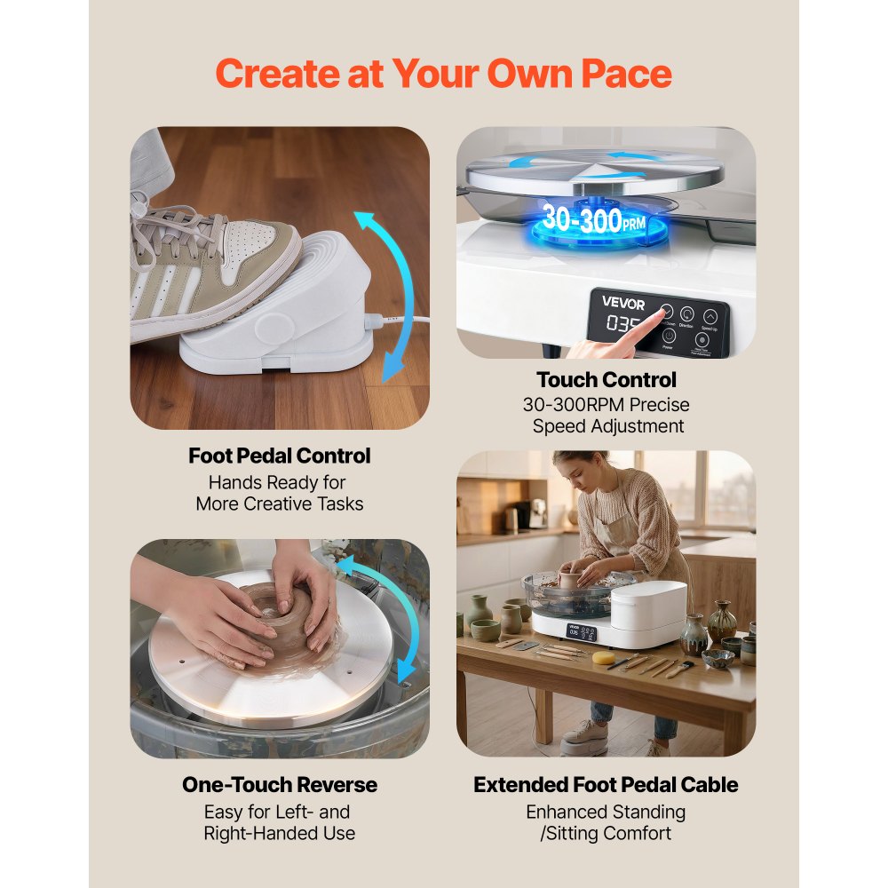Torno de Alfarero, Placas de 36 y 28 cm, Rueda de Cerámica Eléctrica, Velocidad de 30 a 300 RPM, Máquina de Alfarería con Pedal Pantalla Almacenamiento, Aluminio, para Bricolaje Arcilla, Blanco - Tecnología