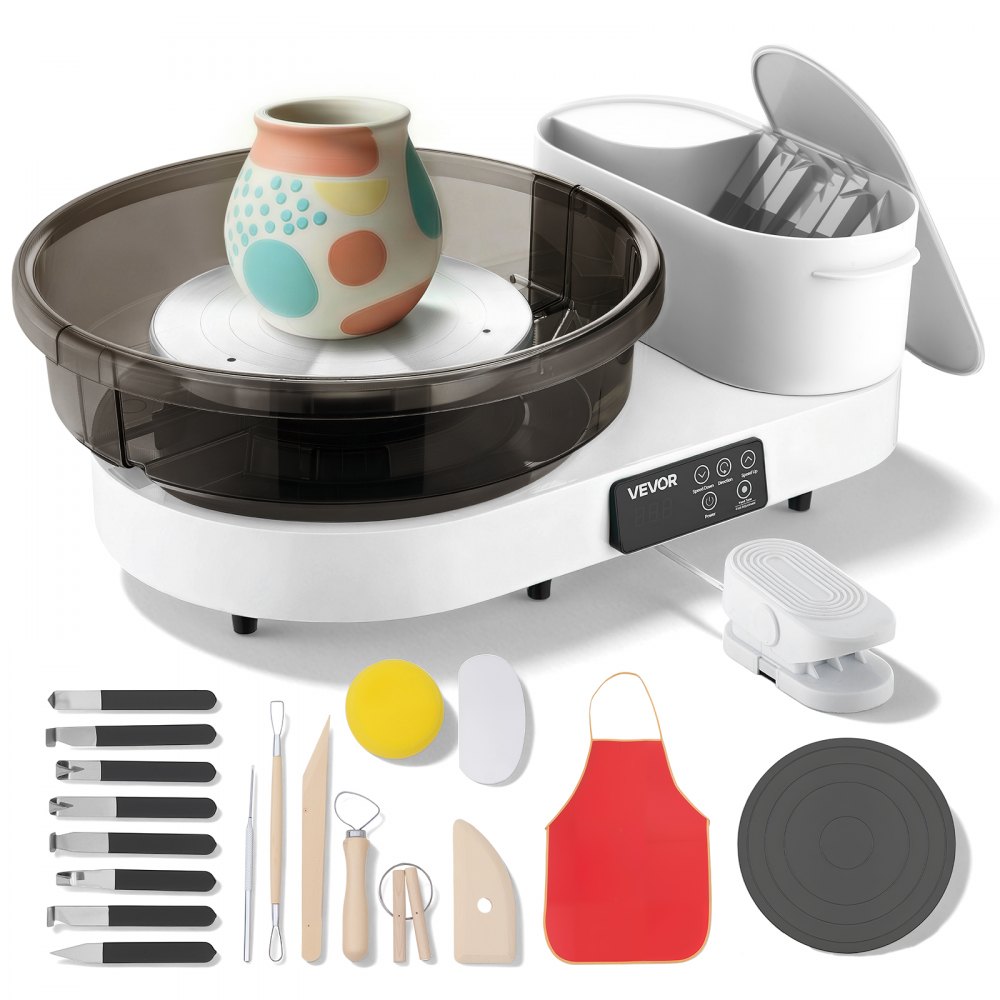 Almacenamiento de herramientas integrado: Nuestra rueda de cerámica eléctrica le permite concentrarse en su arte. El compartimento multifuncional mantiene el agua, las herramientas de corte y los artículos esenciales a mano, reduciendo el desorden para un flujo de trabajo creativo e ininterrumpido