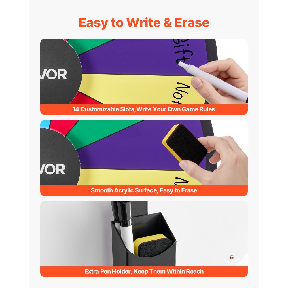 Prispôsobiteľné a upraviteľné: 14 slotov na prispôsobenie vašich hier. Hladká, prepisovateľná hracia doska so žiarivými farbami zaručí, že vaše koleso výhier vynikne na každej udalosti.