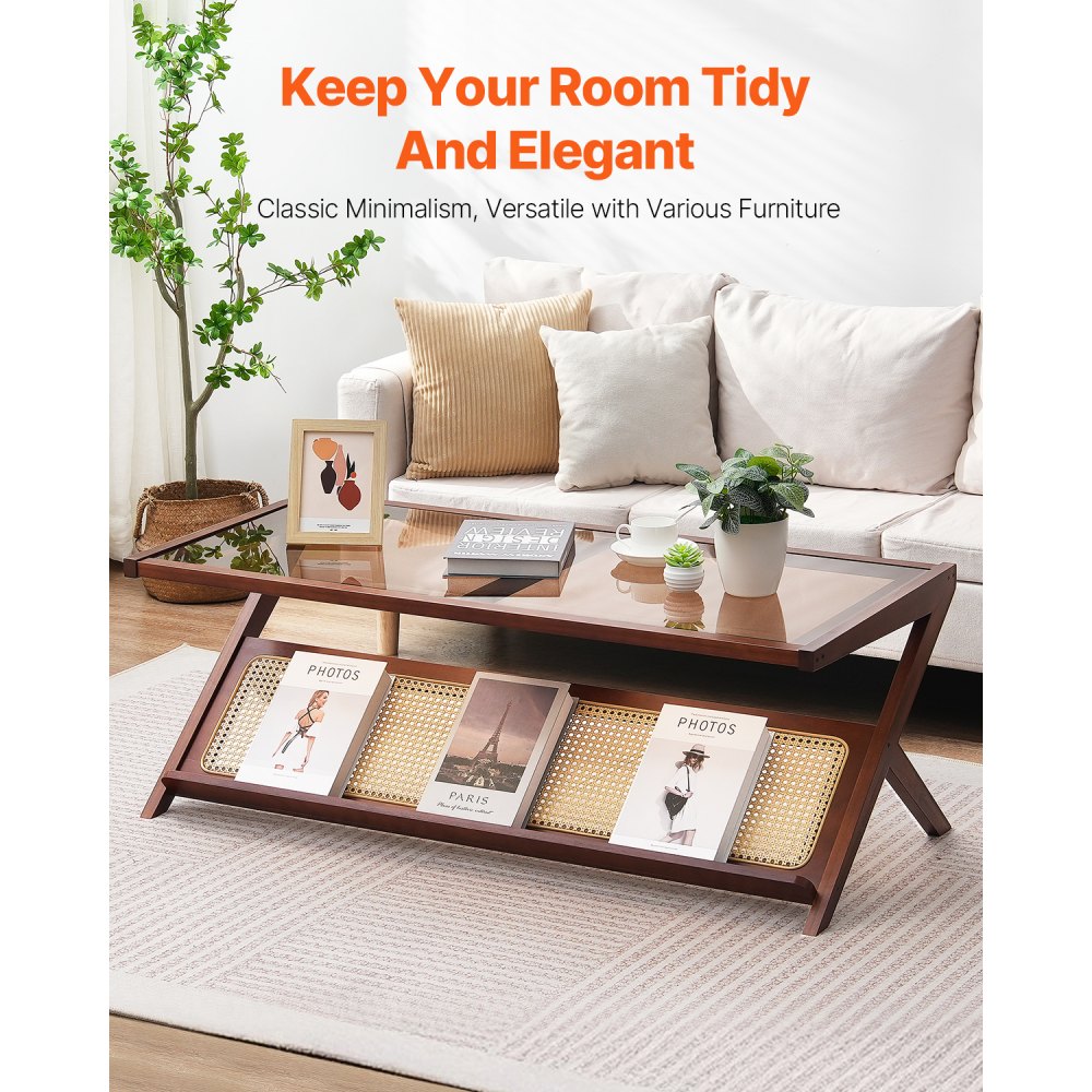 Konferenčný stolík VEVOR z ratanu, konferenčný stolík v tvare Z z ratanu a tkaného bambusu s doskou z tvrdeného skla, moderný boho konferenčný stolík s úložným priestorom 47” s nohami z prírodného bambusu, do obývačky, spálne a malých priestorov - Kancelárske potreby