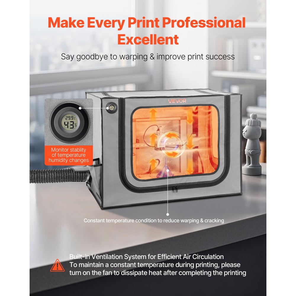 Konštantná teplota: Táto skrinka pre 3D tlačiareň poskytuje konštantnú teplotu, ktorá pomáha spotrebným materiálom dobre priľnúť. Obsahuje termohygrometer na zníženie deformácie a praskania. Môže znížiť riziko upchatia a zasekávania, čím sa zvýši účinnosť.