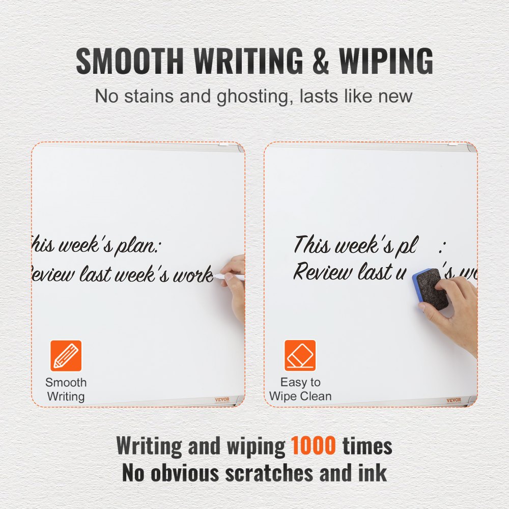 Hodvábne písanie a stieranie: Magnetická biela tabuľa VEVOR má písaciu plochu 23" x 17" pre efektívnu komunikáciu a tímovú prácu. Jej povrch s vypaľovacou farbou ponúka ultra hladké písanie, ktoré sa ľahko utiera a nezanecháva žiadne viditeľné škrabance ani stopy po atramente ani po 1000 použitiach. Rozlúčte sa s otravnými škvrnami a duchmi!