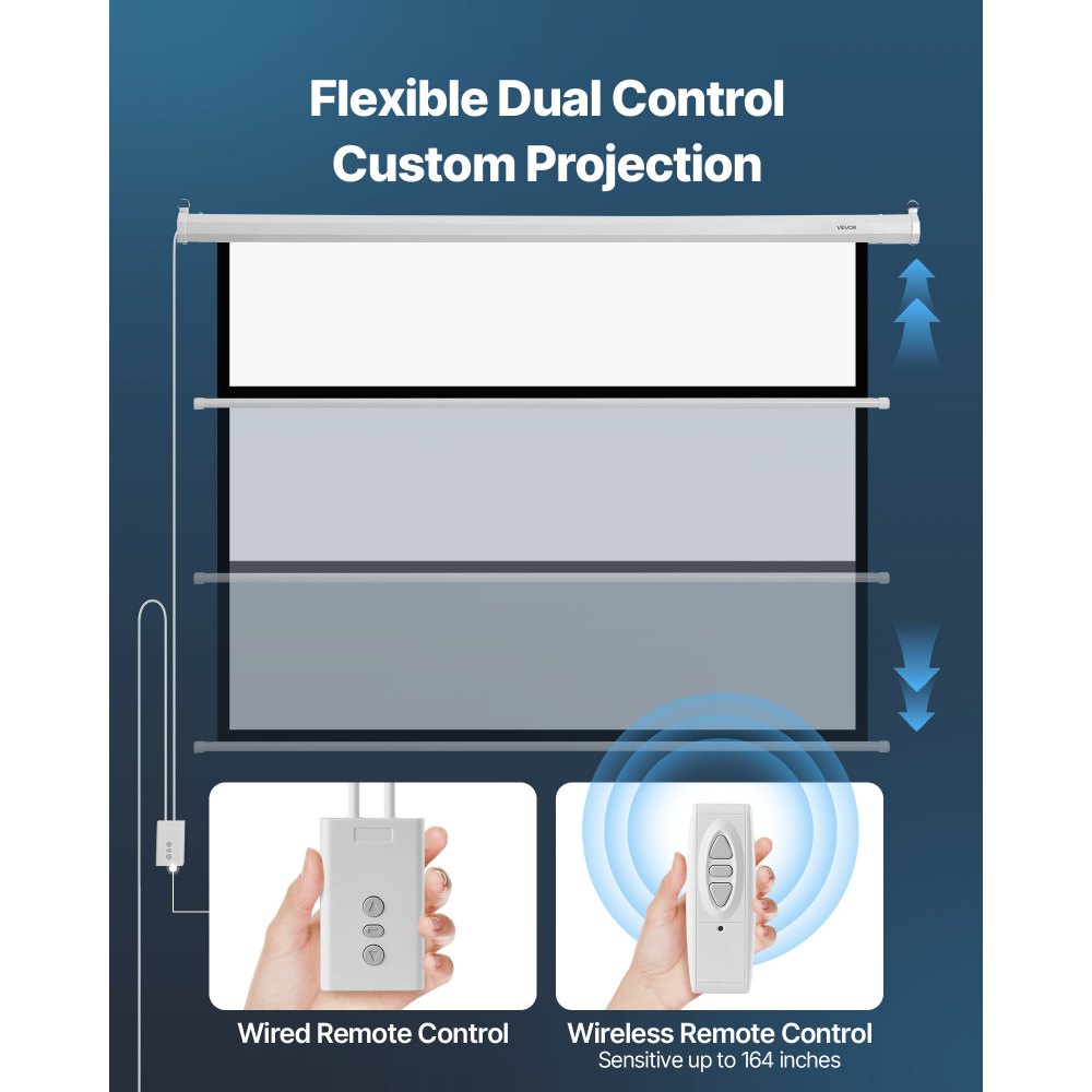Bezproblémové ovládanie: Projekčné plátno poskytuje bezdrôtové diaľkové ovládanie s dosahom 50 m a káblový dotykový panel, čo vám umožňuje bez námahy a ľahko nastaviť výšku plátna. Zažite pohodlie bezproblémového ovládania na dosah ruky.