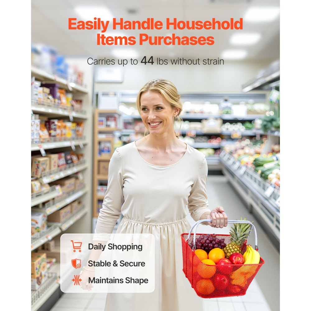 Nákupné košíky VEVOR, 12 ks, stohovateľné kovové košíky na potraviny s úchytkami s objemom 22 l, hustá sieťovina, nosnosť až 20 kg, prenosné do potravín, maloobchodu, obchodov, supermarketov, kníhkupectiev, domáce použitie, červené