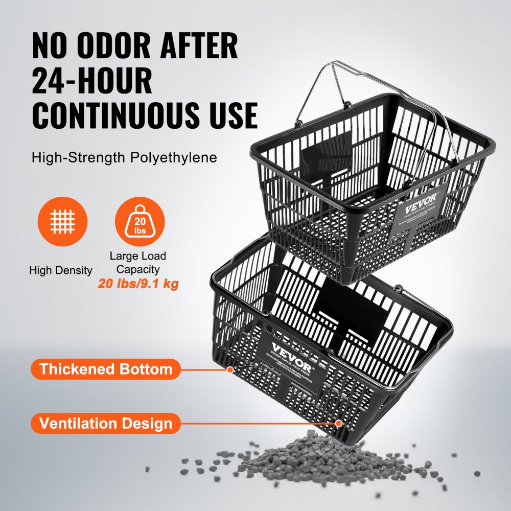 Nákupný košík VEVOR, sada 12 kusov, 21l odolný plastový košík na potraviny s kovovou rukoväťou a stojanom, 16,73 x 12,01 x 8,58 palca, prenosný košík na nákupy v maloobchode, supermarkete, čierny