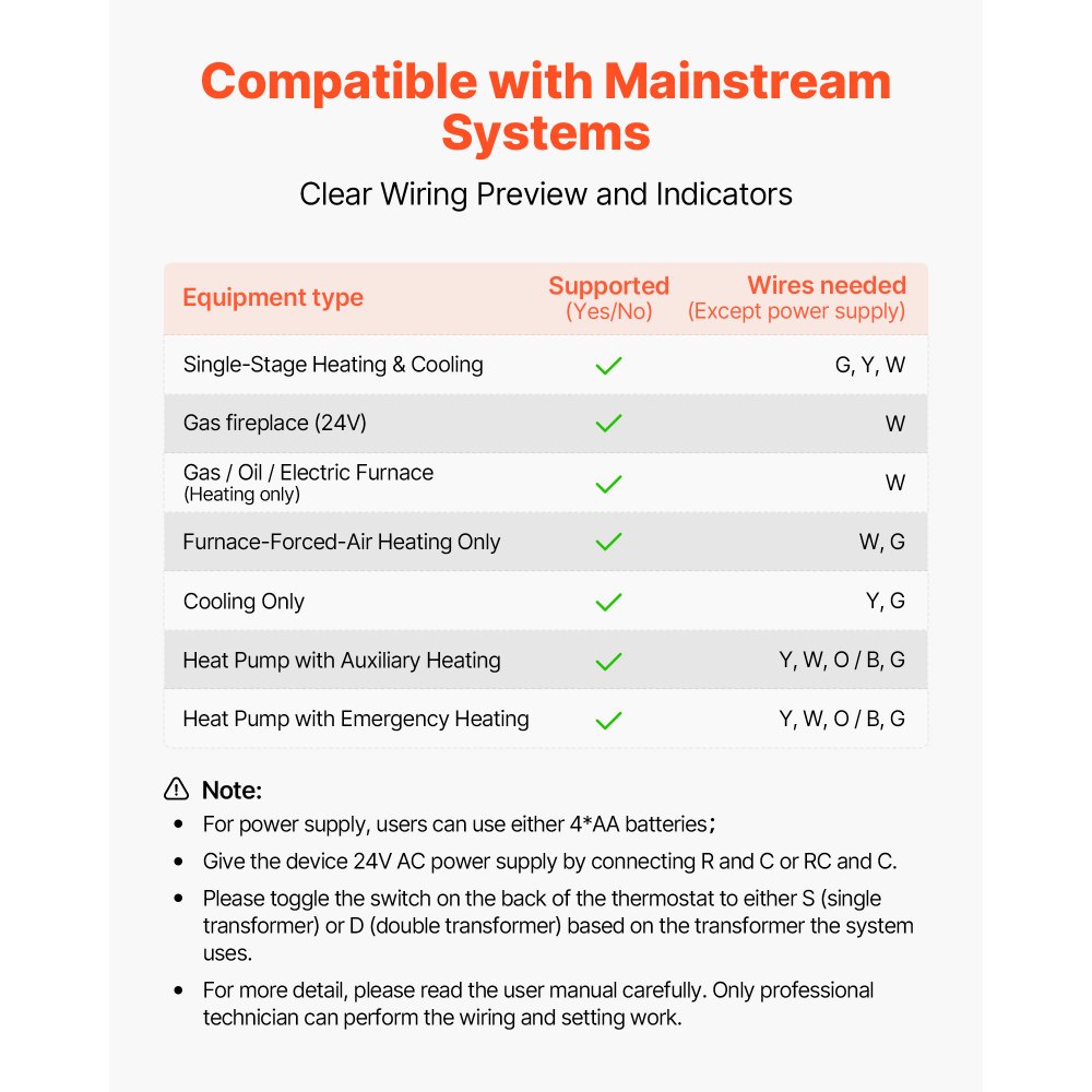 Kompatibilné systémy: Tento domáci termostat funguje s podlahovým kúrením, systémom topenia snehu, klimatizáciou, tepelnými čerpadlami, plynovými a vodnými ohrevmi a na reguláciu teploty používa podlahové/vnútorné senzory. (Vyžaduje sa suchá batéria alebo 24V vedenie)